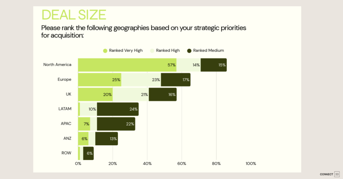 Only 10% of buyers ranked LATAM “High” — but 24% ranked it “Medium,” putting combined interest at 34% and ahead of both APAC (29%) and ANZ (19%). That Medium proves buyers are watching the region–the deals we track each month are part of what’s moving that needle.